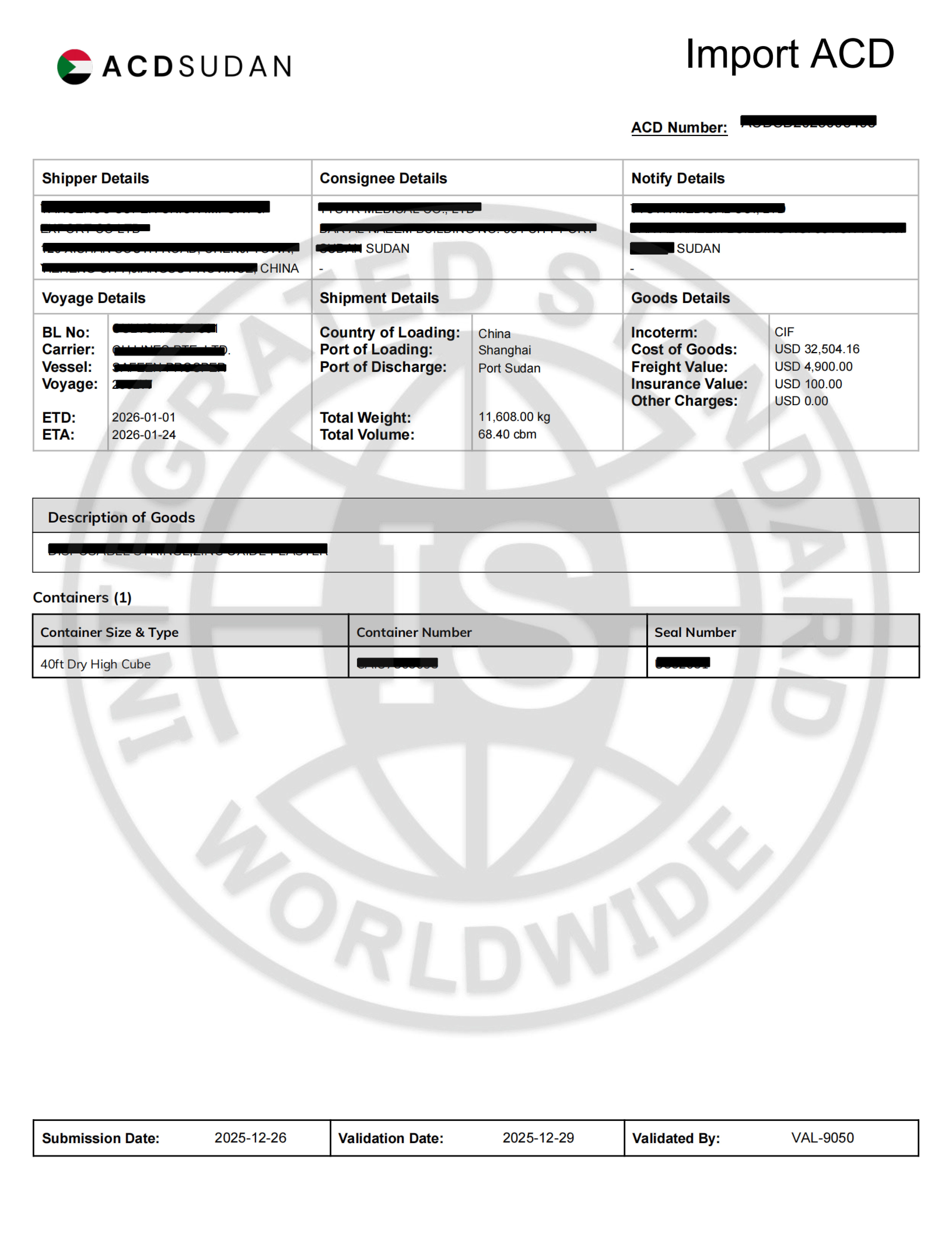 苏丹ACD将是强制性的,托运人、出口商或货运代理应从起运港申请办理。除此以外,每份提单上还必须注明对应的苏丹ACD跟踪单号码。否则,货物的清关和转运过程中可能会出现问题。
